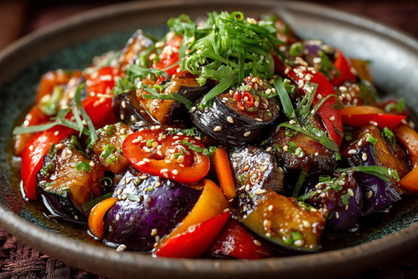 4 баклажана нарезаю средними кубиками. Тушу на сковороде с небольшим количеством воды под крышкой 10–15 минут до мягкости, даю остыть. 1–2 моркови натираю на корейской терке, 2 болгарских перца и 1 луковицу нарезаю тонкой соломкой, 2–3 помидора — дольками. 3–4 зубчика чеснока мелко рублю. В большой миске соединяю все подготовленные овощи и остывшие баклажаны. Добавляю пучок мелко нарезанной петрушки. Для заправки: в отдельной емкости смешиваю 1–2 ст. л. соевого соуса, 1–2 ст. л. яблочного уксуса (или сок лимона), 1 ч. л. мёда (или сахара), 3–4 ст. л. растительного масла, 1–2 ч. л. молотого кориандра, молотый красный и чёрный перец по вкусу, 1–2 ч. л. кунжута. Взбиваю вилкой. Заправку выливаю в миску с овощами. Тщательно, но аккуратно перемешиваю все ингредиенты, пробую на соль и кислоту, при необходимости корректирую. Даю салату постоять при комнатной температуре 30–60 минут, чтобы вкусы соединились.