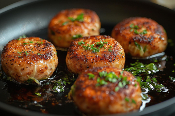 Одну большую луковицу мелко режем и пассеруем с небольшим количеством растительного масла. В килограмм говяжьего фарша вбиваем сырое яйцо, добавляем в смесь лук и капусту, соль, перец и все вымешиваем руками. Скатываем небольшие шарики из фарша, панируем их в муке или сухарях и выкладываем на разогретую сковороду с маслом, чуть прижимая рукой.