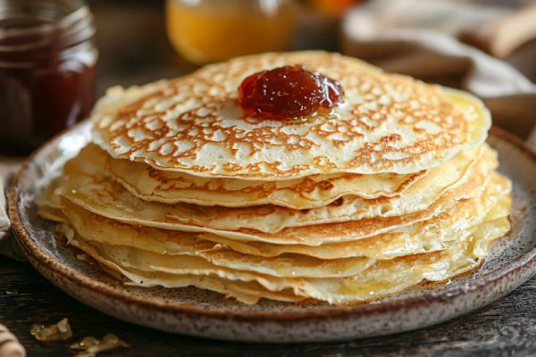 Секрет этого рецепта — в основе на минеральной воде и растительном масле, которые создают эластичное тесто, а добавление крахмала придает блинам ту самую нежную, чуть хрустящую по краям текстуру.